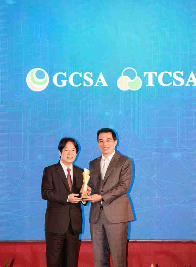 达全方位永续表现获全球永续奖及台湾永续奖肯定,,由副总统赖清德颁奖 (左),,,2121非凡总经理柯富仁 (右) 代表领奖